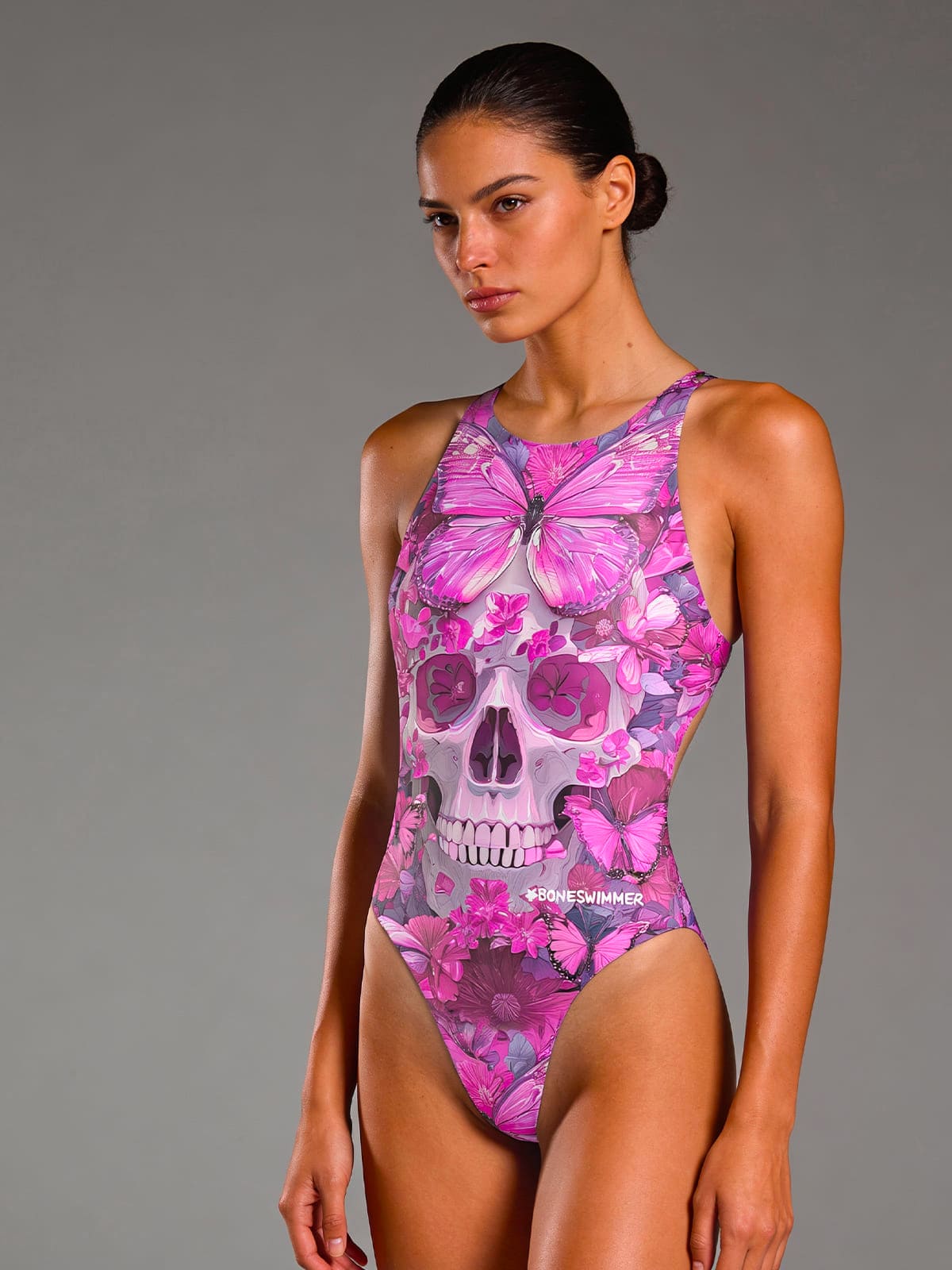 Damski strój kąpielowy jednoczęściowy treningowy Pinup 552P - Teschio Farfalla