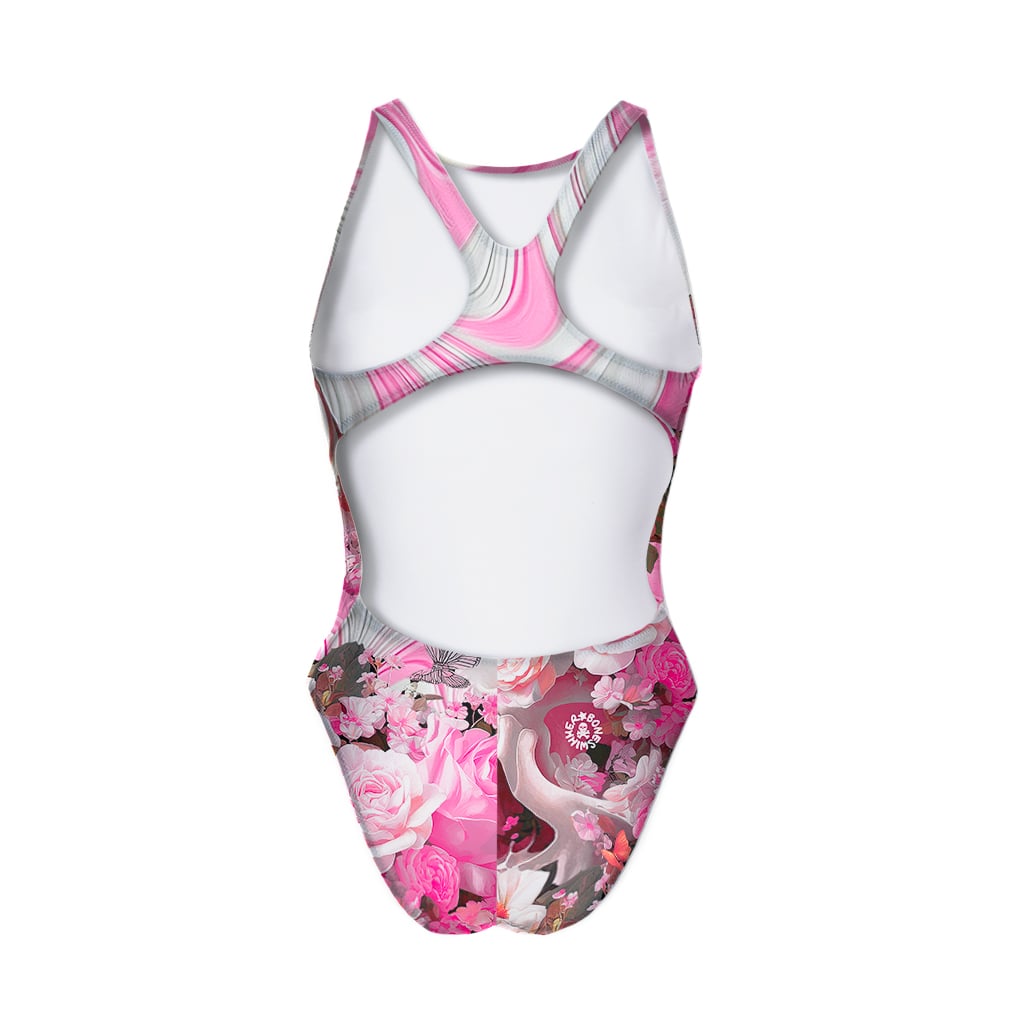 Jednoczęściowy strój treningowy dla dziewczynki, model Pinup. Nadruk „Różowa Czaszka”: ikoniczna czaszka złagodzona koroną kwiatów i motyli, dla wyglądu łączącego siłę i delikatność w basenie.