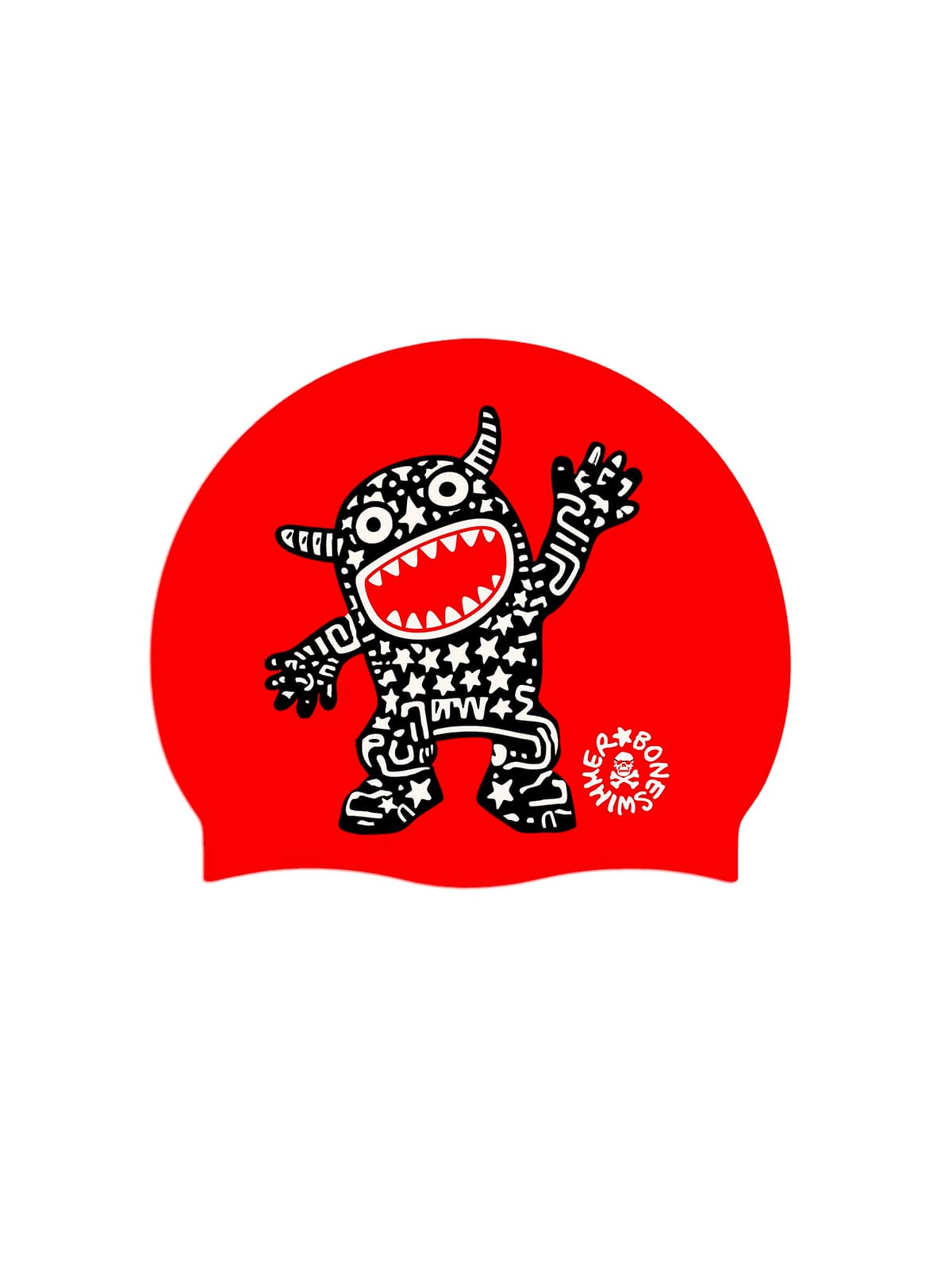 Styl: żywy i sympatyczny, z ilustracją stylizowanego plemiennego potwora, pokrytego białymi gwiazdami na czarnym tle. Postać nawiązuje do elementów sztuki ulicznej i tatuaży plemiennych, tworząc silny kontrast na jaskrawoczerwonym tle, co daje efekt wizualny o dużym impakcie. Rysunek jest dynamiczny i młodzieńczy, przekazując energię, oryginalność oraz poczucie zabawnej buntu.